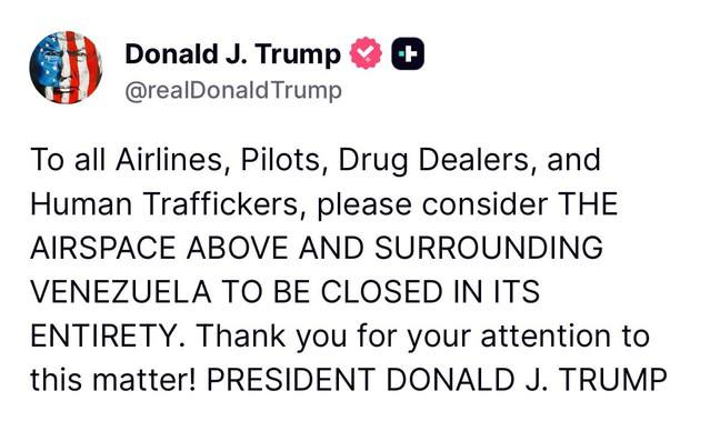 Trump — via a post on his social-media platform — has told “airlines, pilots … drug dealers and human traffickers” to treat Venezuelan airspace as fully closed.